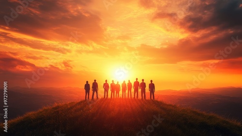 People standing shoulder to shoulder on a hilltop, looking towards a bright sunrise, symbolizing hope and unity