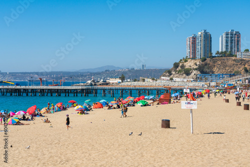 People sun bathing at Caleta Portales beach, Valparaiso, Valparaiso Province, Valparaiso Region, Chile