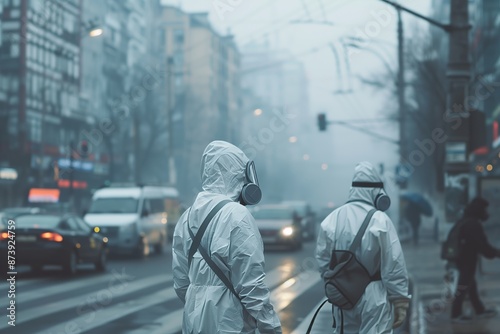 People using bio hazard suits on city streets due to pandemia