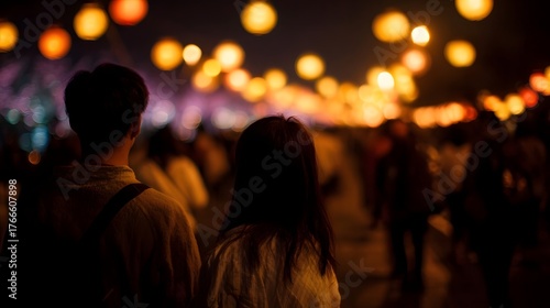 people, strolling, lantern, festival, night, lantern, light, crowd, bokeh, glow, illuminated, dark, outdoors, walk, figure, atmosphere, vibrant, colourful, orange, yellow, purple, festive, event, gathering, magic, ambience, dreamy, soft, warm, bright, blurry, spectator, street, path, decor, sphere, enjoyment, life events, background, visitor, shining, entertainment, leisure, evening, sharpened, mood, scene