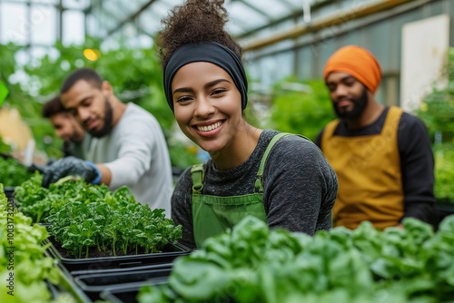 People working together in an indoor hydroponics greenhouse to grow fresh produce sustainably and efficiently