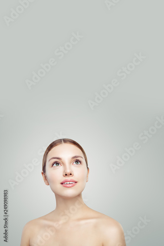 Perfect girl looking up on background with copy space. Woman face close up. Perfect model with clear skin. Facial treatment, skincare and cosmetology concept.
