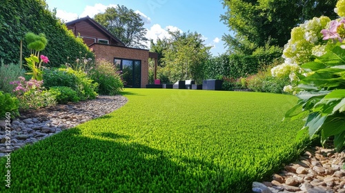 Perfect Lawn. Beautiful Garden with Shiny Flowerbeds and Lush Green Grass in Spring