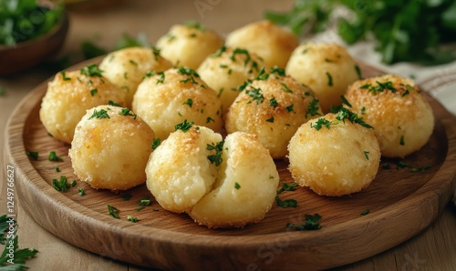 Perfectly arranged potato dumplings on a wooden platter, garnished with fresh herbs, ready to be served on a cozy evening.