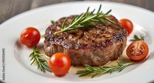 Perfectly grilled round steak adorned with fresh rosemary and bright cherry tomatoes on white plate