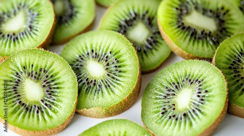 Perfectly sliced kiwi showing vibrant green seeds against the white background.