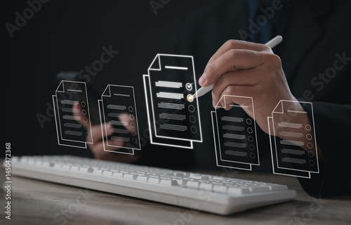 Performance checklist concept : businessman using stylus pen with laptop for questionnaire, evaluation, assessment online or survey exam and filling out for digital survey and checklist....