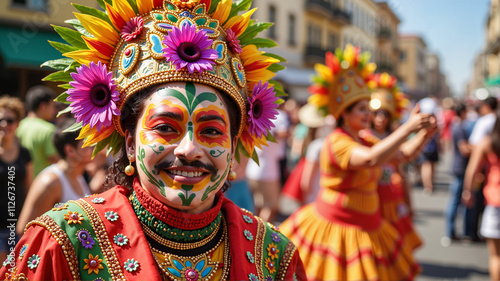 performer, face paint, carnival, festive, brazilian, celebration, vibrant, artistic, joy, cultural, traditional, cheerful, happiness, summer, lively, costume, holiday, parade, expressive, holiday spirit, creative, joyful