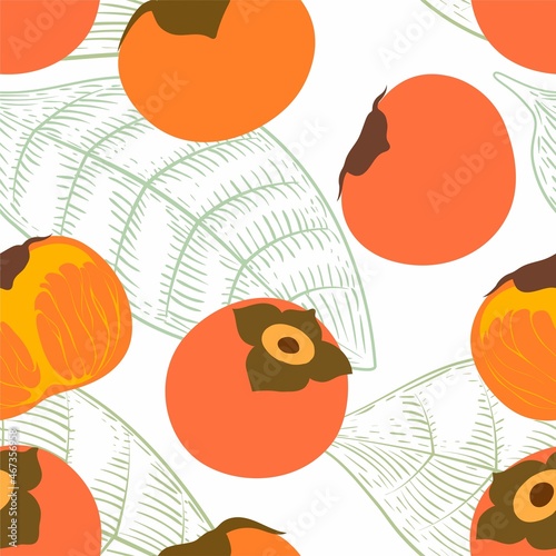 Persimmon and leaves seamless background. Korean motives. Asian style. For fabrics, wrapping paper, children's illustrations, etc.