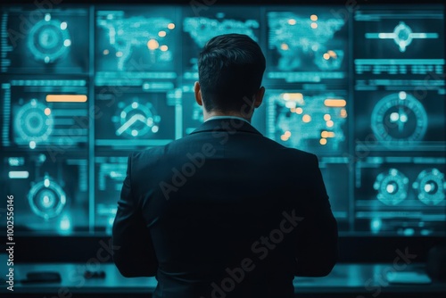 Person analyzing data on digital screens at control center.