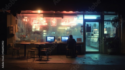 Person at computer in storefront illuminated by neon lights at night