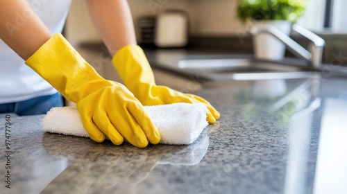 cleaning, kitchen, countertop, granite, glove, yellow, clothes, wipe, tidy, bright, fresh, sanitation, hygiene, remove, dirt, surface, shine, household, chore, sparkly, maintain, home, interior, modern, task, spring, wellness, environment, health, organised, neat, kitchen utensile, appliance, preparation, tool, care, technique, detail, soft
