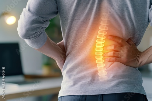 Person experiencing back pain with glowing spine illustration on isolated background.