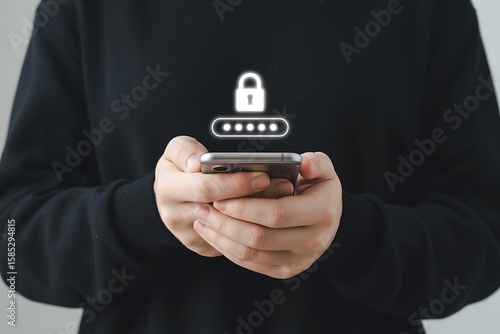 Person hands holding smartphone with glowing lock and password input mobile phone