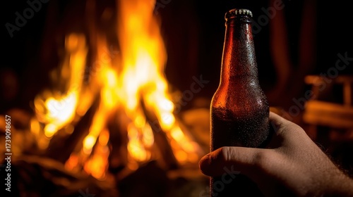 Person Holding Cold Bottle Near Cozy Campfire with Blazing Flames and Warm Glow in Nature Night Setting