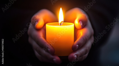 person holding lit candle symbolizes solemn moment, evoking feelings of peace and reflection. warm glow of flame illuminates their hands, creating serene atmosphere