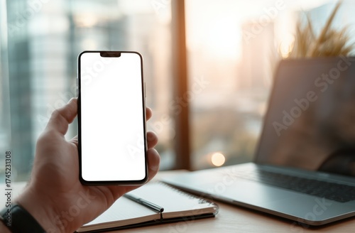 Person Holding Smartphone with Blank Screen in Bright Modern Workspace Setting