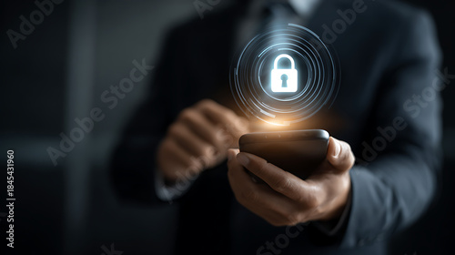 person, smartphone, digital, lock, symbol, security, technology, datum, protection, privacy, network, connection, online, cyber, secure, access, authentication, encryption, mobile, device, hand, business, professional, suit, dark, background, glowing, futuristic, interface, virtual, information, safety, identity, data protection