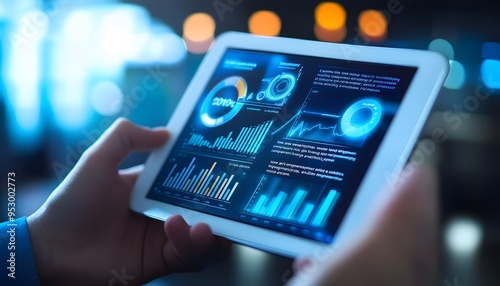hand, finger, tablet, screen, display, blue, graph, chart, datum, statistic, information, business, technology, digital, futuristic, interface, modern, progress, growth, trend, analysis, insight, performance, finance, market, investment, strategy, future, tech, device, contraption, person, holding, white, dark, blur