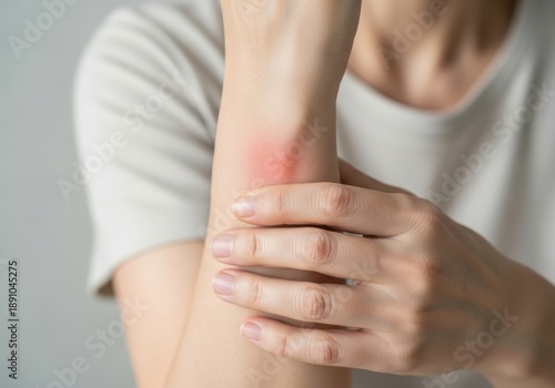 Person holding their elbow with visible red rash or irritation on skin, closeup view of arm