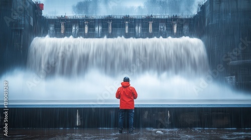 person, water, dam, structure, river, flooding, overflow, energy, power, hydroelectric, rain, weather, engineering, concrete, sky, cloud, flowing, fast, motion, cascade, blurred, stream, view, outside, landscape, wet, dark, grey, blue, jacket, standing, observing, watching, back, environment, surface, level, front, floodgate, control, technology, industrial, construction, natural, resource, man, protection