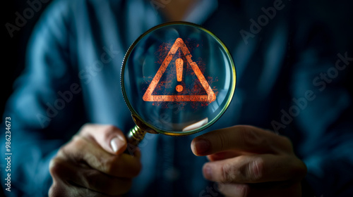 person in blue shirt is holding magnifying glass, focusing on warning symbol, conveying sense of urgency and caution