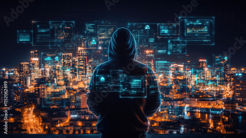 person in hoodie stands against city skyline, surrounded by digital data overlays, conveying sense of technology and urban life