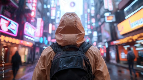 city, street, rain, neon, light, jacket, backpack, urban, nightlife, pedestrian, wet, night, glow, solitude, modern, environment, travel, exploration, exterior, weather, loneliness, scenery, lifestyle, hood, pose, view, emotion, vibrant, culture, architecture, atmosphere, landscape, adventure, movement, digital, photo, people, fashion, activity, city landscape, cloud, mist, dreamlike, mood, sharpened