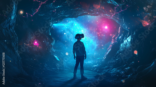 Person in vr headset explores glowing underwater cavern. Starry Cavern. Illustration