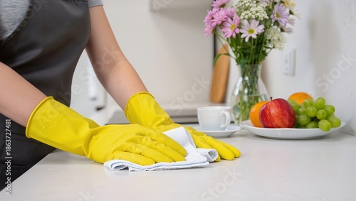 Person in yellow rubber gloves wiping white kitchen countertop with cloth, showing cleaning process on kitchen surface, emphasizing kitchen cleaning task