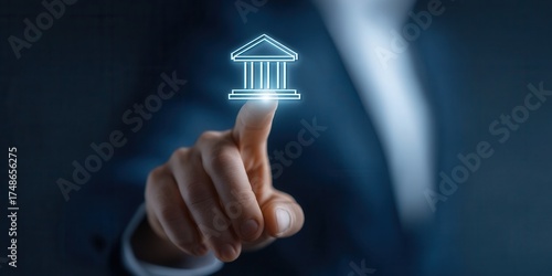 Person Interacting With a Digital Bank Symbol in a Modern Office Setting