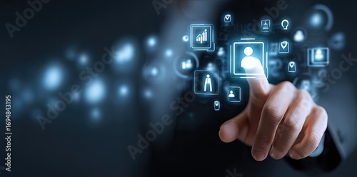 digital, interface, technology, person, hand, touch, screen, interaction, virtual, light, blue, icon, datum, graphic, business, information, modern, futuristic, hover, selecting, pointing, system, future, innovation, design, display, concept, element, user, virtualization, connection, automation, progress