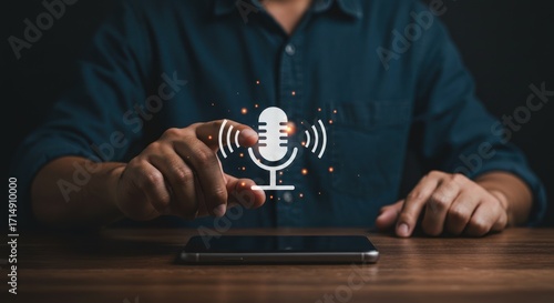 Person interacts with a microphone icon above a phone on a wooden surface.