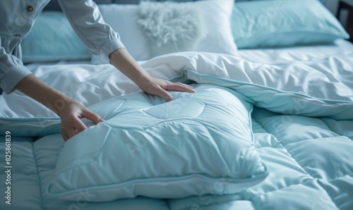 Person Making Bed, Smoothing Sheets and Fluffing Pillows