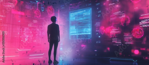 technology, future, digital, interface, screen, datum, information, network, holographic, futuristic, innovation, science, virtual, reality, earth, global, system, code, program, computing, computer, display, graphic, design, neon, light, glow, pink, purple, blue, person, human, children, young, standing, watching, observing, exploring, mysterious, enigma, abstract, background, wallpaper, scene, concept, art
