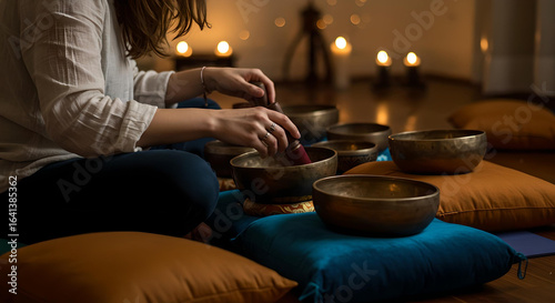 meditation, mindfulness, wellness, peaceful, spiritual, healing, harmony, zen, yoga, holistic, chakra, acoustic, meditative, inner peace, calmness, reiki, traditional, asian culture, ritual, serene, sacred, candlelight, cosy, warm light, therapeutic, seated, hand, closeup, session, mental health, woman, people, senior, lifestyle