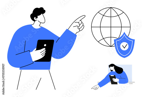 teamwork, collaboration, global, security, protection, shield, tablet, digital, technology, online, global communication, education, connectivity, workspace, cyberspace, innovation, person, desk, pointing, business, professional, metaphor, abstract, concept, flat, web, simple, blue, black, strategy, minimal, interaction, network, work, solution, trust, vector, illustration, icon