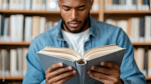 person, reading, book, library, concentration, cognition, education, studying, shelf, interest, learning, literature, sharpened, casual attire, male, young, hobby, culture, indoor, self-improvement, engagement, peaceful, calm, attentive, thoughtful, narrative, imagination, lifestyle, intelligence, discovery, information, exploration, mindfulness, quiet, journey, page, curiosity, activity, inspiration, research, personal, written, fiction, reader, devotion, establishment