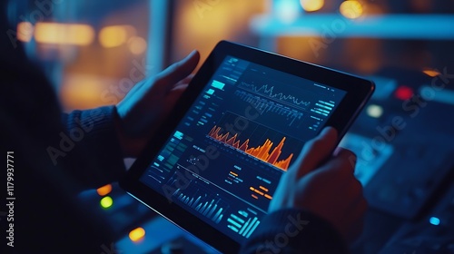 tablet, datum, graph, chart, analysis, person, hand, screen, technology, digital, information, statistic, business, finance, market, trend, number, figure, monitoring, control, display, interface, application, software, device, glowing, orange, blue, dark, night, illuminated, workplace, professional, work, reviewing, studying, examining, assessment, progress, performance, result