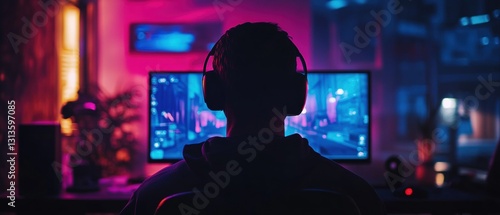 person, earphones, gaming, neon, screen, sharpened, technology, room, light, entertainment, digital, future, atmosphere, lifestyle, solitude, concentration, youth, modern, hobby, leisure, activity, computer, night, virtual, interaction, excitement, backview, creativity, relaxation, online, workspace, community, fun, innovation, thrill, sensory, adventure, passion, energy, colours, design, pixel, art, ambience, life events, engagement, observation