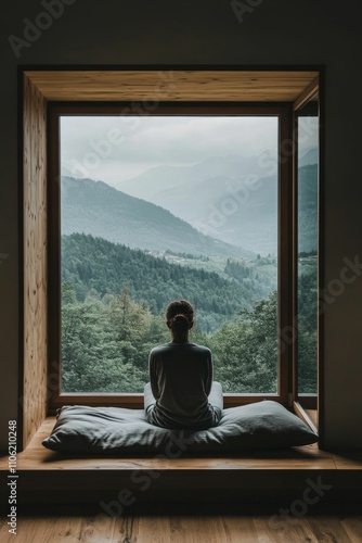 wooden frame, mountain view, forest, hill, tree, person, sitting, backview, serene, peaceful, contemplative, relaxation, nature, landscape, tranquil, calm, quiet, solitude, cosy, comfort, cushion, wood, grey, daylight, home, interior, room, view, contemplation
