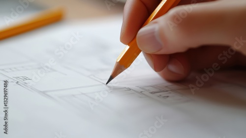 Person sketches architectural plans using a yellow pencil on white paper in a bright workspace