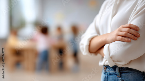 school, employee, torso, children, area, blurred, person, arm, crossed, classroom, education, teacher, learning, student, background, sharpened, professional, environment, teaching, children, indoor, workspace, academic, educator, setting