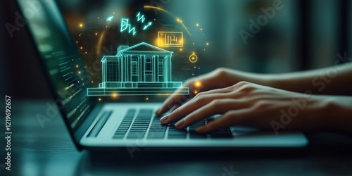 Person types on laptop. Modern tech used for innovative banking solutions. Online banking system displayed. Concept of digital finance. Streamlined processes, new heights in finance. Future of