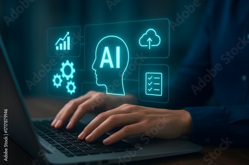 person typing on a laptop keyboard with futuristic digital holograms floating above the screen. The holographic interface shows artificial intelligence (AI) icons