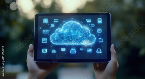 Person uses glowing laptop to access digital cloud storage at sunset in a park