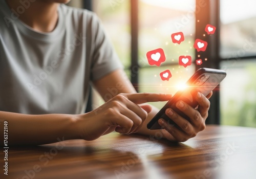 smartphone, mobile, phone, hand, social, media, like, heart, engagement, app, online, digital, communication, network, connection, notification, feedback, interaction, technology, user, person, scrolling, tapping, appreciation, viral, content, cyberspace, web, usage