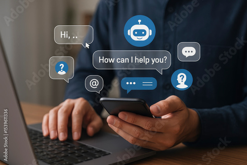 client, ai, artificial intelligence, support, help, online, digital, communication, laptop, smartphone, computer, technology, robot, messaging, automation, future, innovation, business, problem solving, query, answer, assistance, interface, modern, concept, network, virtual