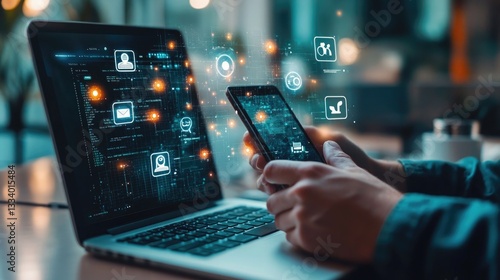 Person using laptop and smartphone with digital interface showing icons and data network connections