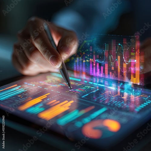 datum, analysis, chart, graph, tablet, technology, digital, business, finance, investment, marketing, statistic, trend, growth, innovation, modern, hand, stylus, screen, interface, information, visualisation, neon, colours, vibrant, bright, dark, background, futuristic, abstract, progress, development, planning, strategy, success, future, global, economy, market, research, report, dashboard, performance, result, science, big